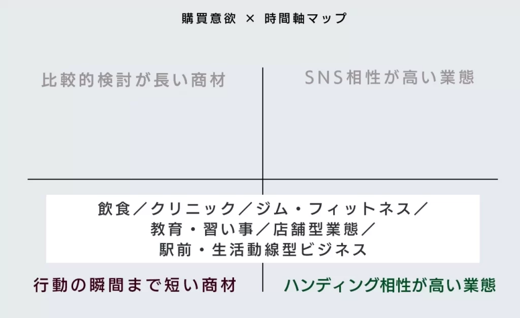 短期的に行動が起こりやすいきっかけ(来店・相談)と、中長期での比較検討(SNS保存・あとで調べる)がどちらも発生する領域です。この2つの行動が混在する業態は、リアルとデジタルを組み合わせることで最も成果が伸びやすくなります。